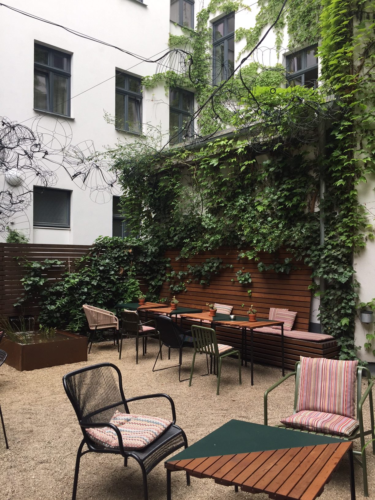 Frukosten serveras à la carte och kan avnjutas på innergården under varmare dagar, eller i lobbyns soffor och fåtöljer medan folklivet utanför rullar förbi genom de öppna fönstren. På takterrassen hålls yogaklasser vissa morgnar, ett stillsamt sätt att börja dagen i en annars pulserande stad.